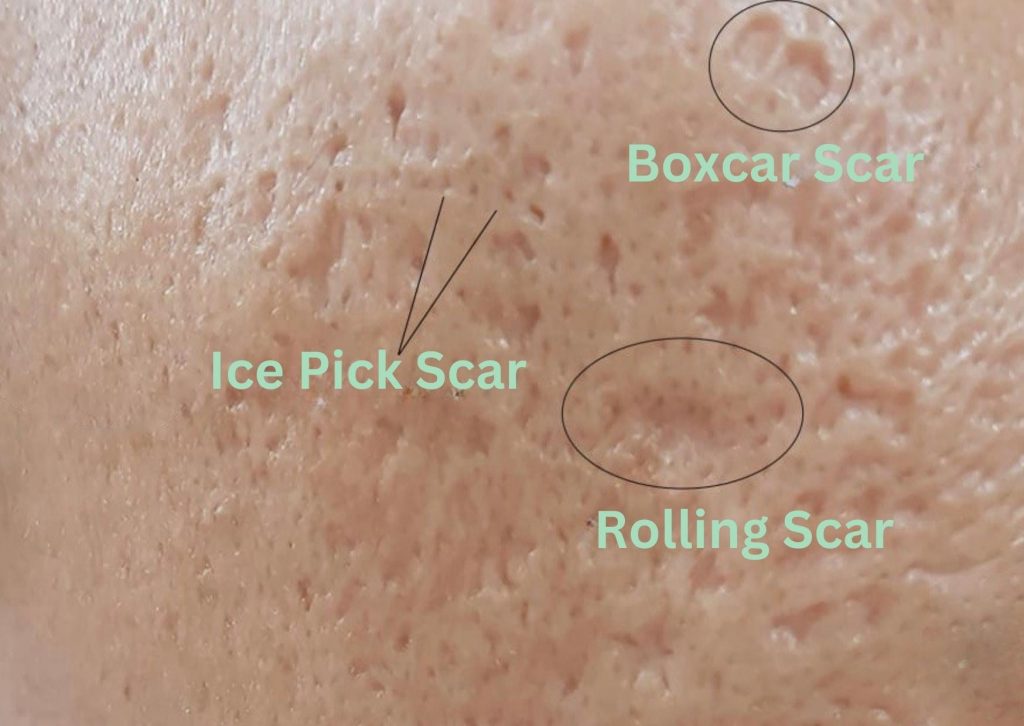 Comparaison des cicatrices « Ice Pick », « Boxcar » et « Rolling »